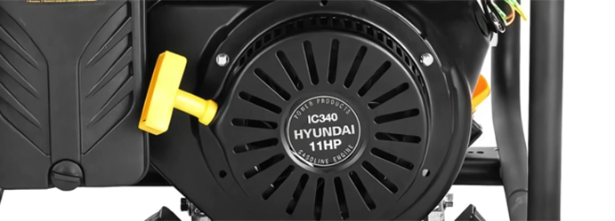 4-тактный двигатель бензинового генератора Hyundai запускается с ручного стартера, который обладает системой облегченного старта. За счет нее от вас не потребуется много усилий для вытягивания пускового тросика.