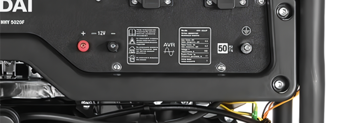 На панели управления размещены две розетки 16 А, к которым подключаются однофазные потребители. При этом Hyundai HHY 5020F снабжен системой контроля AVR, которая автоматически стабилизирует напряжение, защищая от скачков и короткого замыкания.