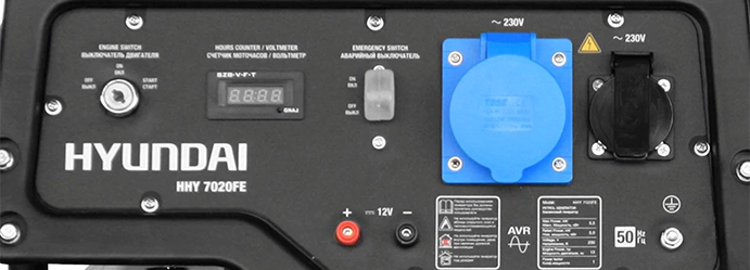 Генератор Hyundai HHY 7020FE оснащен цифровым дисплеем, на который выводятся такие рабочие показатели, как напряжение, ток, частота, количество моточасов. В случае короткого замыкания или перегрузки выработка тока автоматически прекращается во избежание поломки подключенного оборудования.