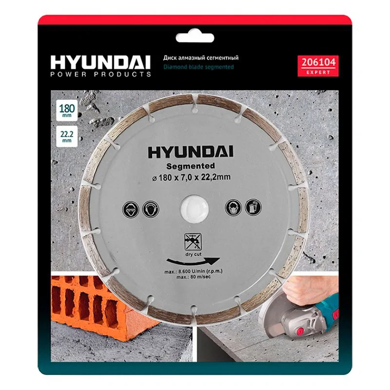 Диск алмазный для УШМ Hyundai изготовлен из высококачественной закаленной стали 65 Mn. Большая концентрация синтетических алмазов в режущей кромке диска для длительного ресурса и высокой производительности резки. Диск имеет компенсационные прорези и не требует дополнительного охлаждения водой во время работы. Режущая кромка изготовлена методом горячего прессования.