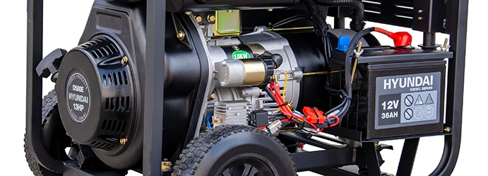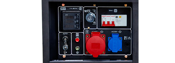 На панели управления дизельного генератора Hyundai размещены две розетки. Одна предназначена для подключения однофазных потребителей 220 В, а другая для трехфазных 380 В. Также есть выход постоянного тока 12 В, который позволяет заряжать автомобильные аккумуляторы. Уровень шума не превышает 79 дБ, поэтому генератор можно устанавливать около жилых помещений.