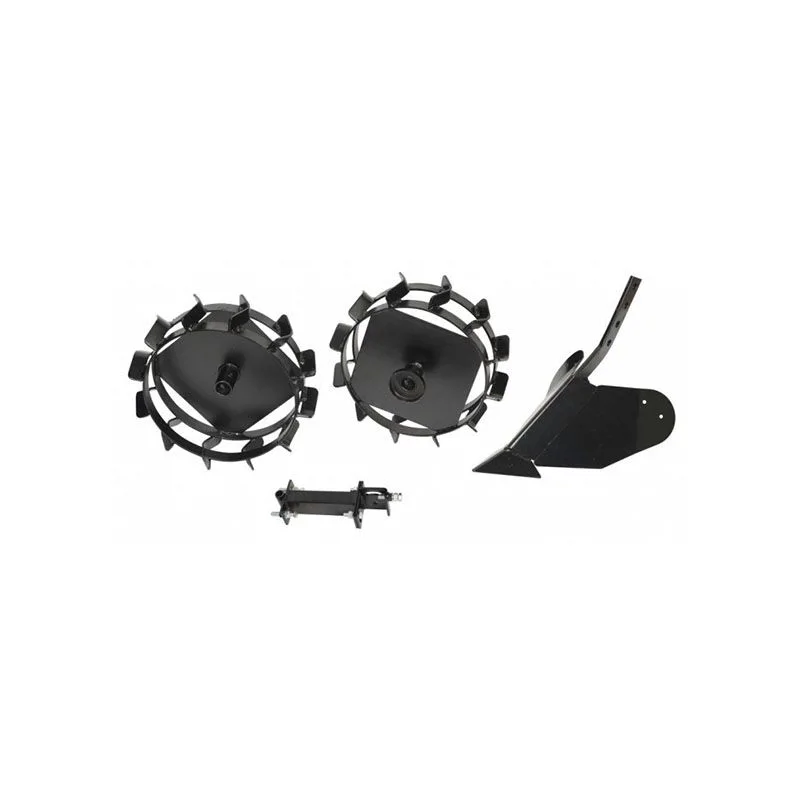 В комплект входят грунтозацепы, плуг-окучник и сцепка. Плуг поможет вспахать почву, окучить и прополоть картофель, сформировать ровные грядки на садовом участке. Металлические колеса (грунтозацепы) необходимы, чтобы агрегат не застревал в почве. Их конструкция способствует максимальному сцеплению культиватора с любым грунтом. Сцепка необходима для крепления навесного оборудования на культиватор.