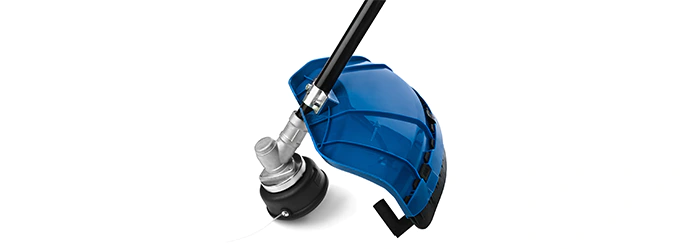 Широкий пластиковый кожух защищает оператора от попадания камней и земли, вылетающих из-под лески.